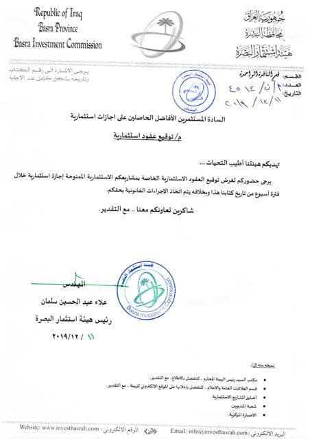 يرجى حضوركم لغرض توقيع العقود الاستثمارية الخاصة بمشاريعكم الاستثمارية الممنوحة إجازة استثمارية خلال فترة أسبوع من تاريخ كتابنا هذا وبخلافه يتم اتخاذ الإجراءات القانونية بحقكم.