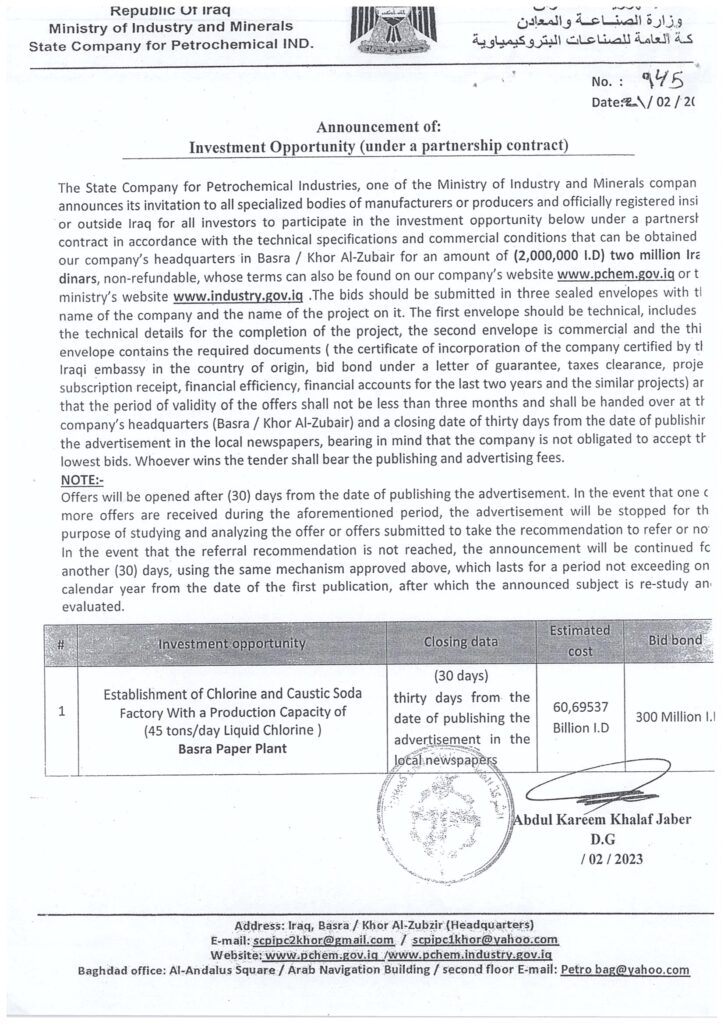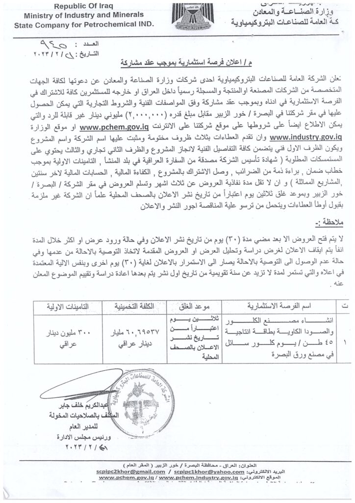 اشارة الى كتاب وزارة الصناعة و المعادن – دائرة الاستثمارات المرقم (13044) في 23/3/2023 , بخصوص إعادة اعلان فرصة المشاركة مع القطاع الخاص التابعة للشركة العامة للصناعات البتروكيماوية والخاصة بمشروع (انشاء مصنع الكلور والصودا الكاوية بطاقة إنتاجية 45 طن / يوم كلور سائل في مصنع ورق البصرة).