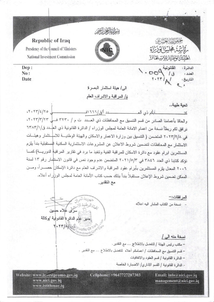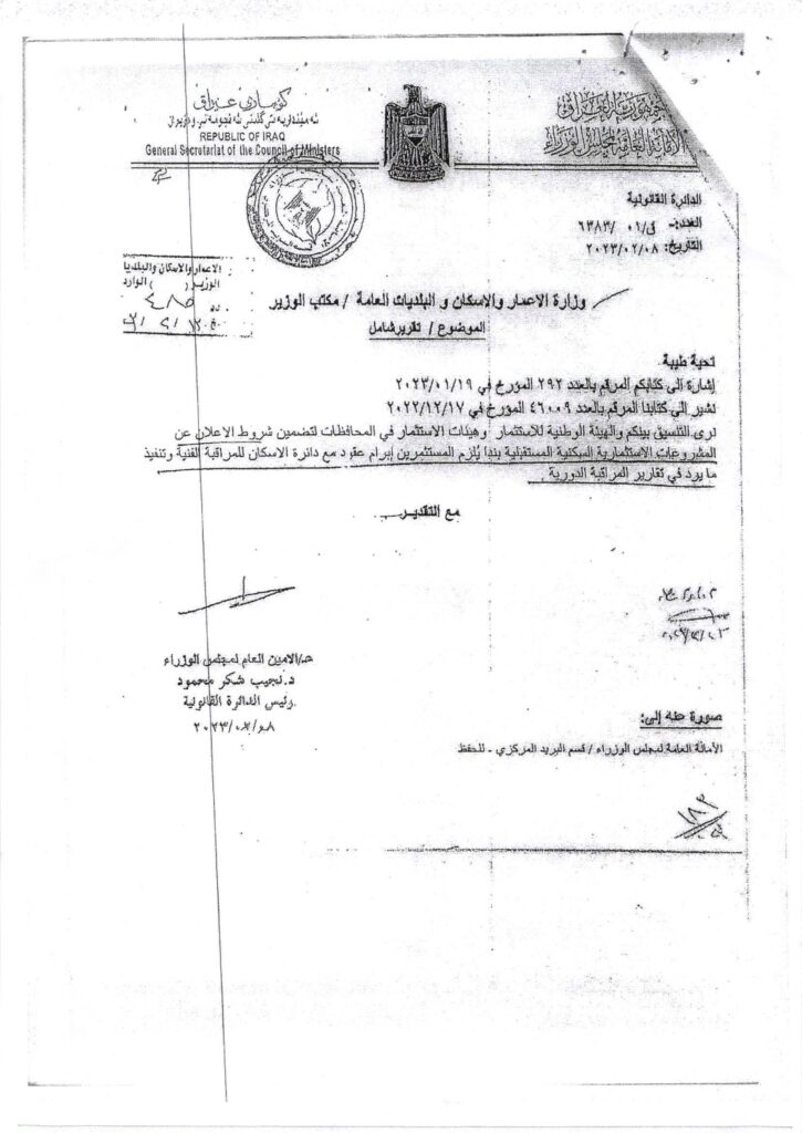 اشارة الى كتاب الهيئة الوطنية المرقم ق / 10559 في 20/8/2023 و مرفقه كتاب الامانة العامة لمجلس الوزراء المرقم ق/ 01 / 6383 في 8/2/2023 , المتضمن التنسيق بين وزارة الاعمار و الاسكان و الهيئة الوطنية للاستثمار و هيئات الاستثمار مع المحافظات لتضمين شروط الاعلان عن المشروعات الاستثمارية السكنية المستقبلية بندا يلززم المستثمرين ابرام عقود مع دائرة الاسكان للمراقبة الفنية و تنفيذ ما يرد في تقارير المراقبة الدورية .