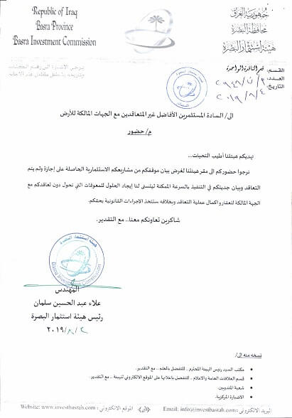 نرجوا حضوركم الى مقر هيئتنا لغرض بيان موقفكم من مشاريعكم الاستثمارية الحاصلة على اجازة و لم يتم التعاقد و بيان جديتكم في التنفيذ بالسرعة الممكنة ليتسنى لنا ايجاد الحلول للمعوقات التي تحول دون تعاقدكم مع الجهة المالكة للعقار و اكمال عملية التعاقد و بخلافة ستتخذ الاجراءات القانونية بحقكم .