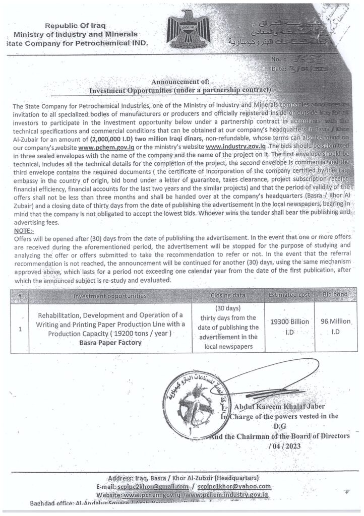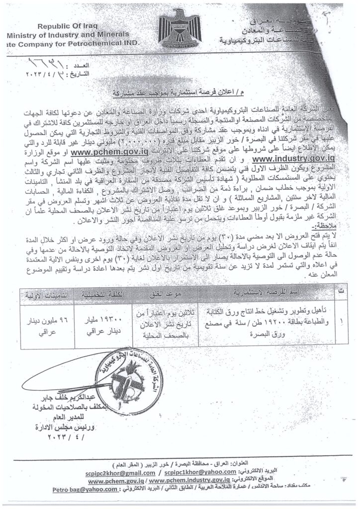 اشارة الى كتاب وزارة الصناعة و المعادن – الشركة العامة للصناعات البتروكيمياوية المرقم (1631) في 3/4/2023 , بخصوص اعلان تاهيل و تطوير و تشغيل خط انتاج ورق الكتابة و الطباعة بطاقة 19200 طن سنويا في مصنع ورق البصرة) .
