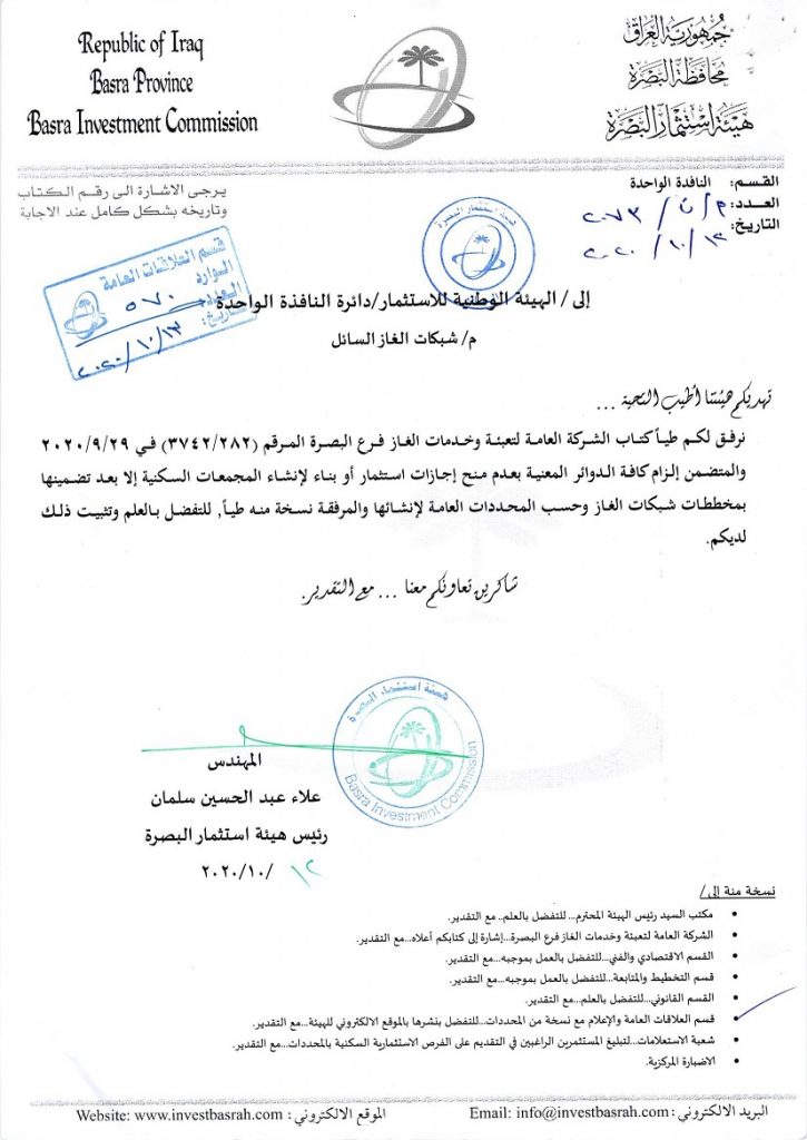 اشارة الى كتاب الشركة العامة لتعبئة و خدمات الغاز فرع البصرة المرقم 282/3742 في 29/9/2020 .